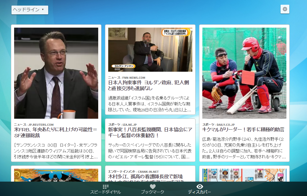 割りと可能性を感じたのがこの「ディスカカバー」機能。スマホで言うところの「Gunosy(グノシー)」や「SmartNews」の様なものです。ニュース記事をサムネイル付きで表示してくれます。クリックすると新しいタブで表示します。