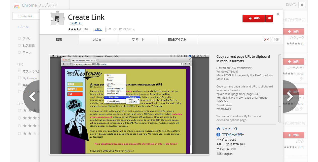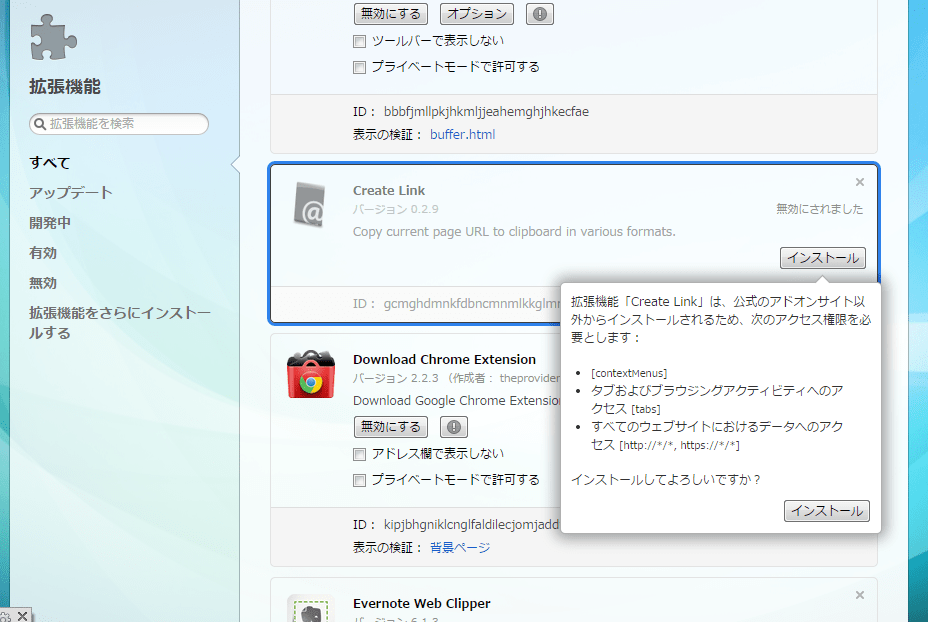「Download Chrome Extension」をインストール後に「Chrome ウェブストア – アプリ」へ行きます。試しに「Create Link」をインストールしてみます。ていうかコレをインストールしたかったんです。