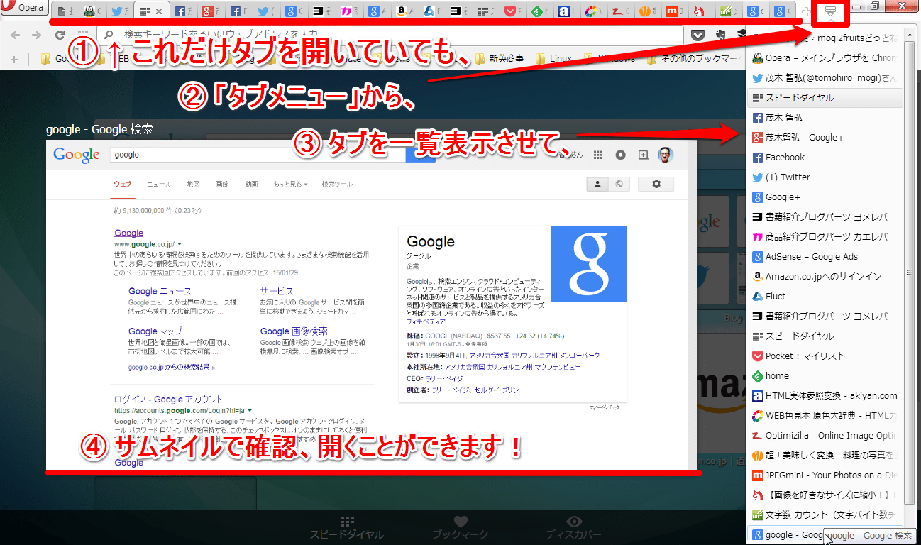 これだけタブを開いていても、リスト一覧で中身もサムネイル表示させることができます。これは便利!