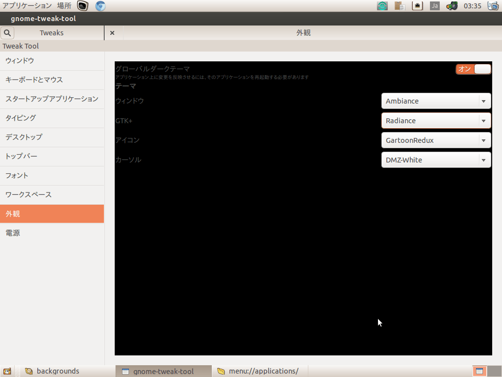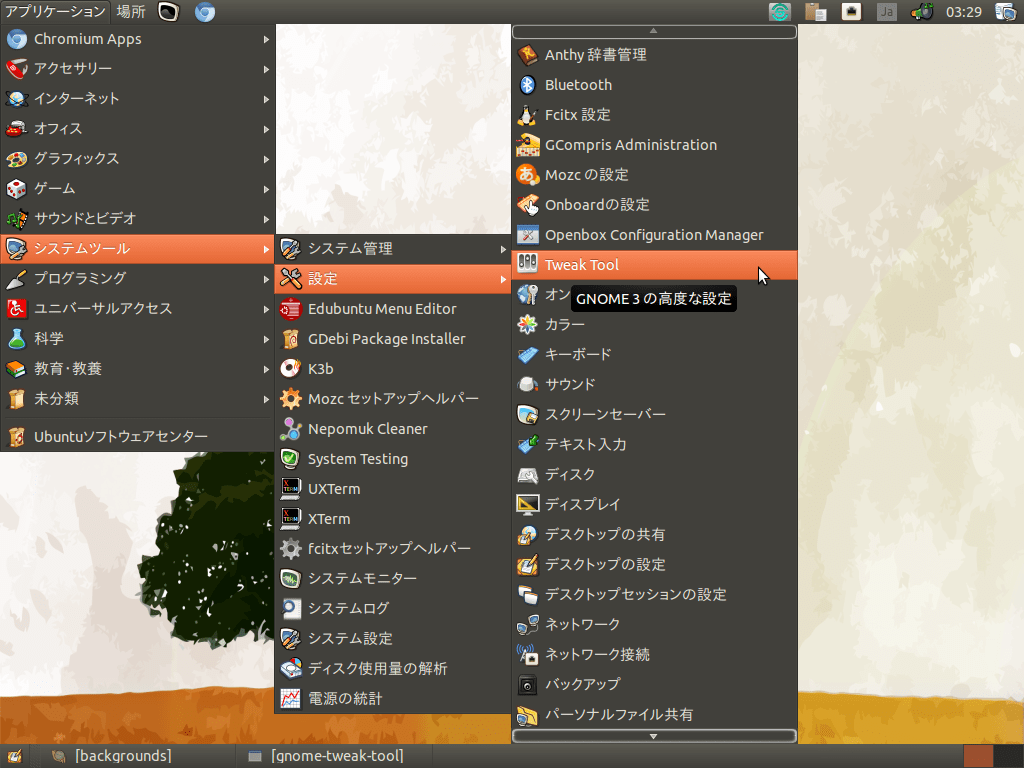 「アプリケーション → システムツール → 設定 → Tweak Tool」から起動します。