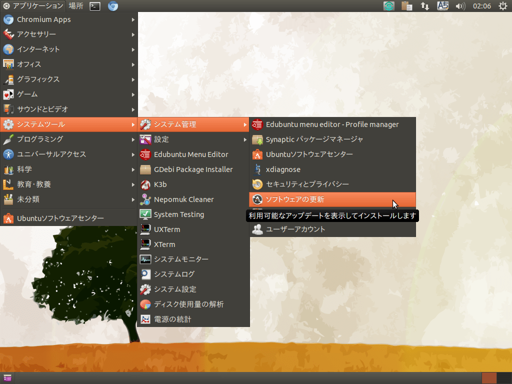 起動したらまずアップデートを確認しましょう。あれば通知が来るはずです。もしくは「アプリケーション → システムツール → システム管理 → ソフトウェアの更新」です。